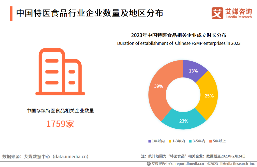特醫(yī)食品作為大健康領(lǐng)域的新藍(lán)海,吸引眾多企業(yè)爭相布局,近2年來市場的新進(jìn)入者明顯增多。iiMedia Research(艾媒咨詢)數(shù)據(jù)顯示,截至2023年2月,中國特醫(yī)食品行業(yè)現(xiàn)存相關(guān)企業(yè)共有1759家。61%的企業(yè)成立時(shí)長在5年以內(nèi);其中,成立3年以內(nèi)的企業(yè)占比高達(dá)38%。